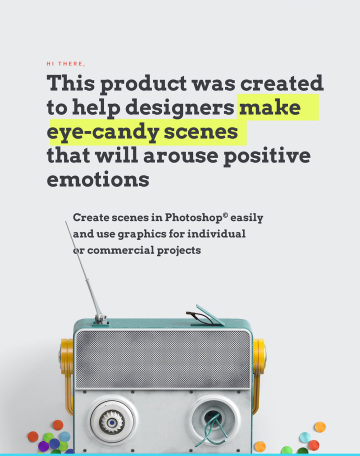 This product was created to help designers make eye-candy scenes that will arouse positive emotions. Create scenes in Photoshop easily and use graphics for individual or commercial projects.