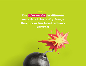 Use color masks with different materials to instantly change the color or fine tune the item’s contrast.
