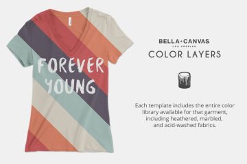 3D地图可以让你的设计元素包裹在每件衬衫上,以达到极致的写实感。每个模板包括一个完整的Bella Canvas颜色库,这样你就可以精确地复制图案到任何织物上。