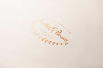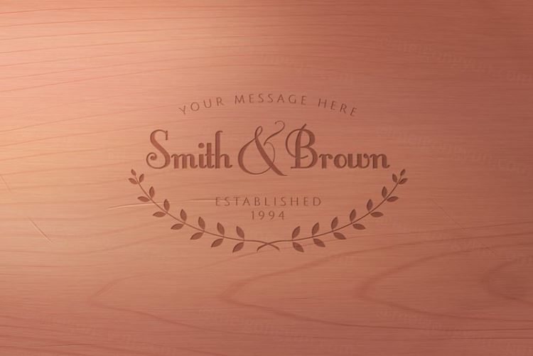 5个真实场景Logo展示样机包括:2个展示样机分别为黑色和粉色的背景上印制了带有凹凸质感的金色字体,橱窗材质的展示样机,木头雕刻材质的展示样机,硬纸板材质的展示样机。