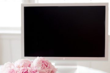 粉色花卉装饰台式电脑样机 Desktop Mockup with Pink Peonies