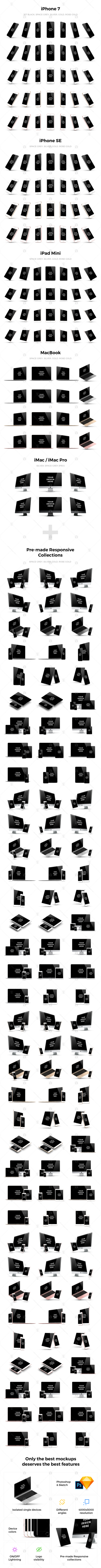 样机分辨率高达4K,同时兼容 PS 和 Sketch,提供6种 Apple 设备 (iPhone 7, iPhone SE, MacBook, iPad Mini, iMac & iMac Pro),每款样机都有8种不同的视觉,5种不同的颜色。