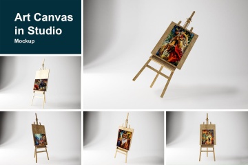 工作室画室场景的画板VI样机展示模型mockups,照片逼真艺术画布样品有一个可以用于您的设计的演示文稿,适用于品牌,并由单独的图层集组成。包含帮助文件。
