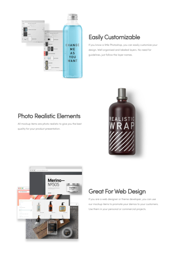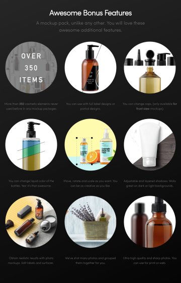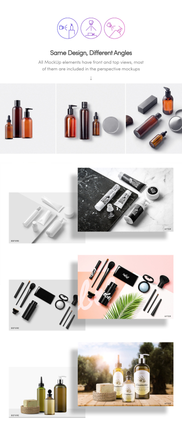 你好。Mockup Zone自豪地推出世界上最全面和高品质的化妆品和元素样机包。大量不同的包装和令人敬畏的物品,彼此很好。完全可定制的瓶子,喷雾器,分配瓶和许多不同类型的包装在一起。所有客房均享有顶部和正面景致。您可以使用相同标签设计的不同视图创建无限制的演示文稿。