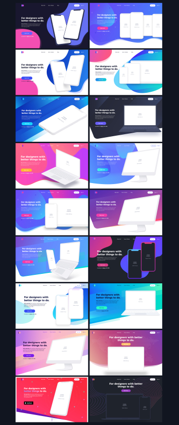 这是一组网站标题,将创意背景与设备模型相结合。一切都是100%的矢量,包括模型,因此它们可以作为svg导出为devs而不是笨重的png。