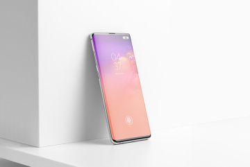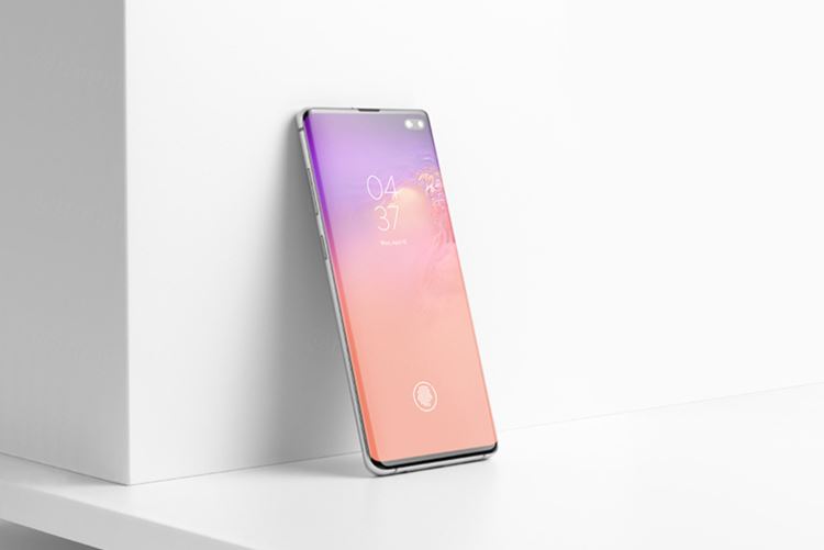 可定制且易于使用的三星Galaxy s10 +智能手机样机,可移动和可编辑的浮动小部件以及所有背景元素的可变颜色。