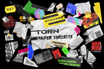 独特的塑料纹理,信头纸,海报,包装,胶带块,撕碎的纸片,贴纸和各种时尚物品的独特集合。非常适合制作大胆,杰出的现代设计。