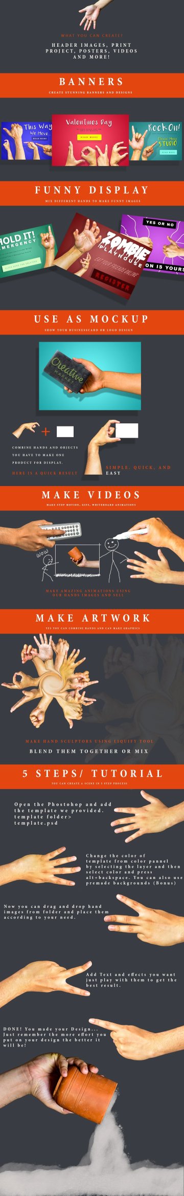 您可以利用它来发挥创意,我的意思是说,这些都是手!你想做什么,就可以做什么!例如创建持有名片,邀请卡,画笔的模型甚至持有巨人的模型。您能做什么?几乎所有具有创造力的头脑都可以!请检查图片以获取灵感)这是几件事情!创意横幅,促销材料,可用于视频,展示产品,与对象结合以制作另一个出色的设计等。功能和文件包含: