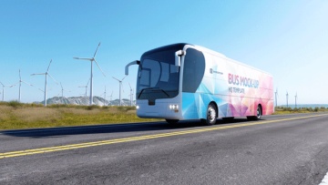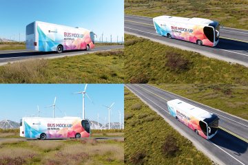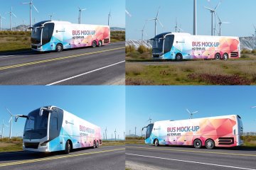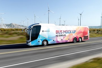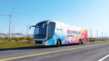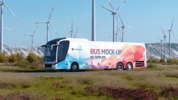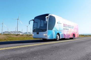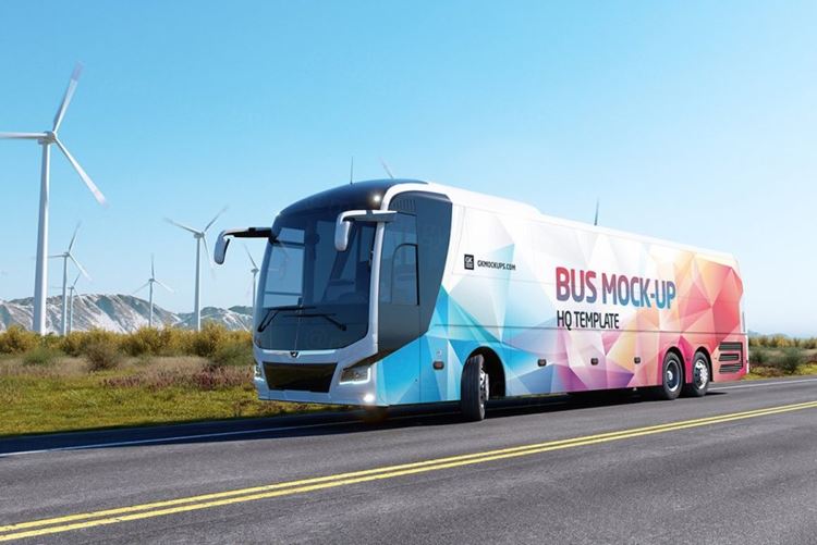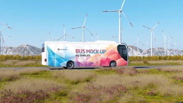 高质量新能源风能企业宣传公交巴士车身广告贴图样机模板 Animated Bus Mock-up