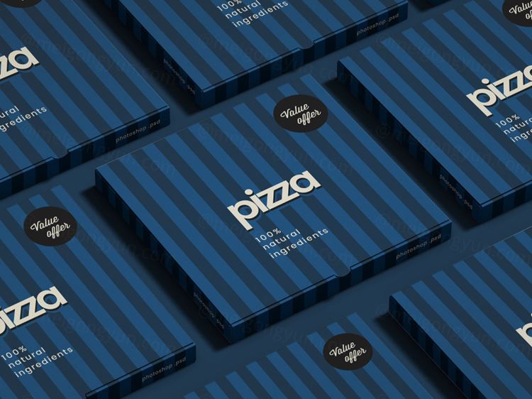 一个智能对象的比萨饼盒模型正是您为客户展示比萨饼包装设计所需要的。几秒钟之内,您就可以得到逼真的包装盒演示文稿
