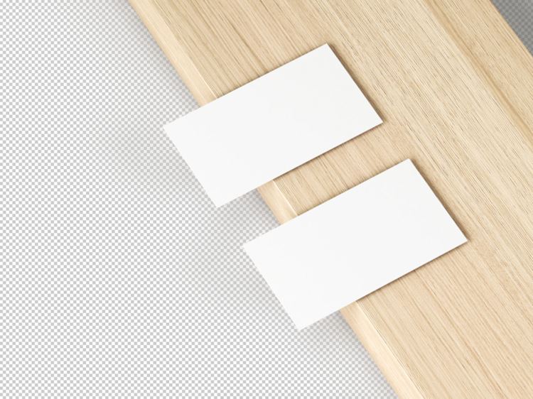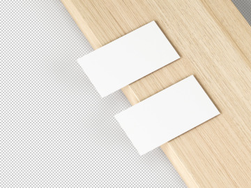 在一块长方形木头的两个亭亭玉立的名片图表大模型在一个现代透视介绍性场面。这是一个具有智能对象功能和组织图层以控制灯光和阴影的photoshop文件。