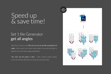 设置1个文件生成器并获取所有角度对您意味着什么?现在,您可以使用一个psd文件并生成所有角度。您需要做的就是将选定的设计放置在一个视图中,并且由于生成器,其余视图会自动更改。“一键式”,项目完成。只需几分钟即可创建连贯的产品照片。制作模型从未如此简单。