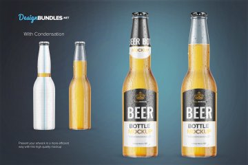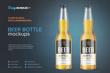 在这些带有冷凝模型的透明玻璃啤酒瓶和冷玻璃啤酒 瓶上,以更有效的方式展示您的设计。您可以使用任何颜色背景!包括特殊图层和智能对象,以供您制作惊艳的艺术品。样本设计不包含在下载的文件中。