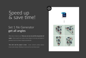 设置1个文件生成器并获取所有角度对您意味着什么?现在,您可以使用一个psd文件并生成所有角度。您需要做的就是将选定的设计放置在一个视图中,并且由于生成器,其余视图会自动更改。“一键式”,项目完成。只需几分钟即可创建连贯的产品照片。制作模型从未如此简单。
