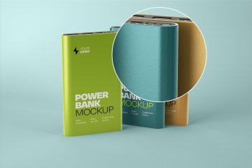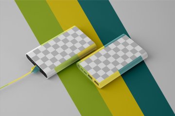 图穷联素材库 » 移动充电宝随身充电电源包装设计样机贴图展示PSD模板 Glossy Power Bank Mockup Set