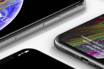 这是psd iPhone XS Max样机透视图等距设置,可以完成所有颜色的标准psd iPhone XS。得益于智能图层,可以轻松地混合搭配添加自己的图形。