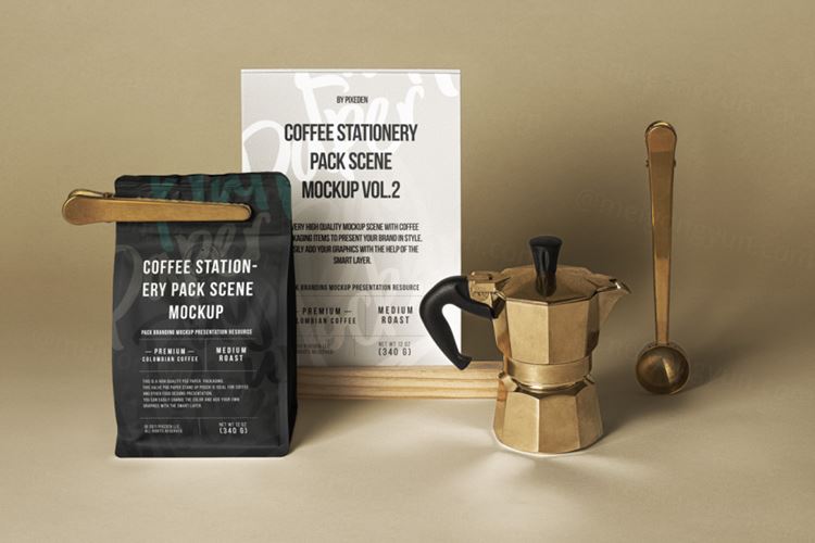 图穷联素材库 » 全新的包装psd咖啡样机 Coffee Psd Stationery Scene Mockup 2