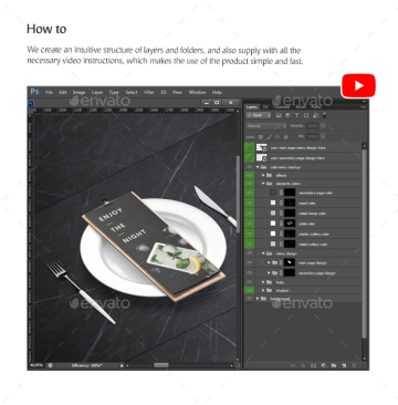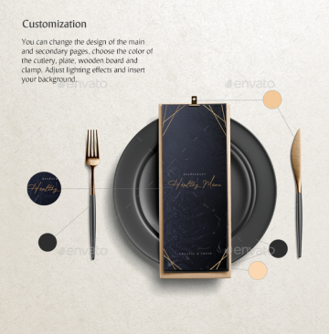 几次点击即可展示您的HoReCa品牌的菜单或酒单设计。选择餐具,盘子,木板和夹子的颜色。
