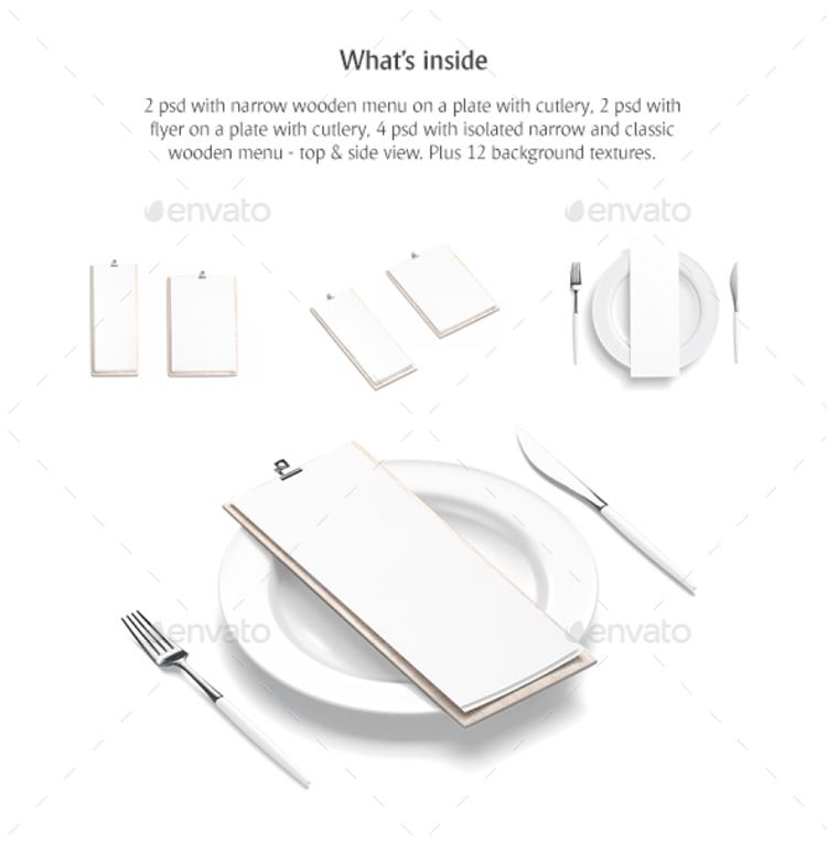 2 psd,带有带餐具的盘子上的窄木菜单(顶视图和侧视图);