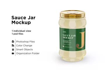 透明玻璃蛋黄酱酱罐包装设计样机,包括用于工作的特殊层和智能对象。盖子有光泽和金属饰面可供选择。包含设计的黄金层。物品以高角度拍摄。下载文件中不包含样本设计。