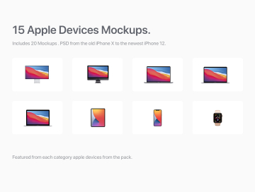 包括20个PSD文件-XDR显示屏(垂直和水平),iMac Pro,16英寸MacBook Pro,15英寸MacBook Pro,MacBook Air,MacBook,iPad Pro,iPad Air,iPad,iPhone 12 Pro,iPhone 12,iPhone 11 Pro, iPhone 11,iPhone XS,iPhone XS Max,iPhone XR,iPhone X,手表S3和手表S4。+使用了奖金封面PSD场景。