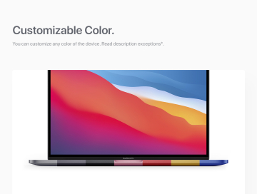 XDR显示屏,iMac Pro,MacBook Pro,MacBook Air,MacBook,iPad Pro,iPad Air,iPad(仅黑白),iPhone 12 Pro,iPhone 12和Watch S3 / S4的可自定义颜色。所有这些设备都包括其各自的默认原始颜色,如银色,深空灰色,金色,太平洋蓝色等。