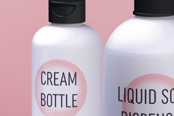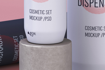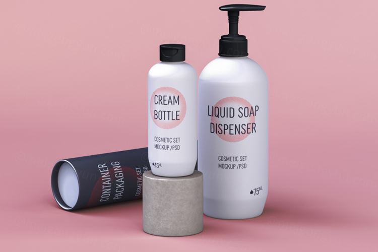 图穷联素材库 » 按压瓶洗浴用品包装设计贴图展示样机模板 Psd Cosmetic Set Scene Mockup