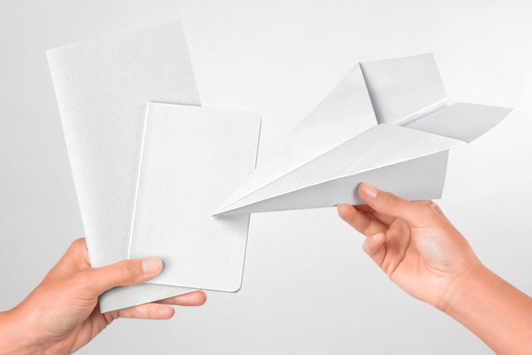这是一款时尚的 psd 文具模型,手持 psd 笔记本和纸飞机,具有旅行日记风格。使用智能图层更改颜色并使其成为您自己的颜色。