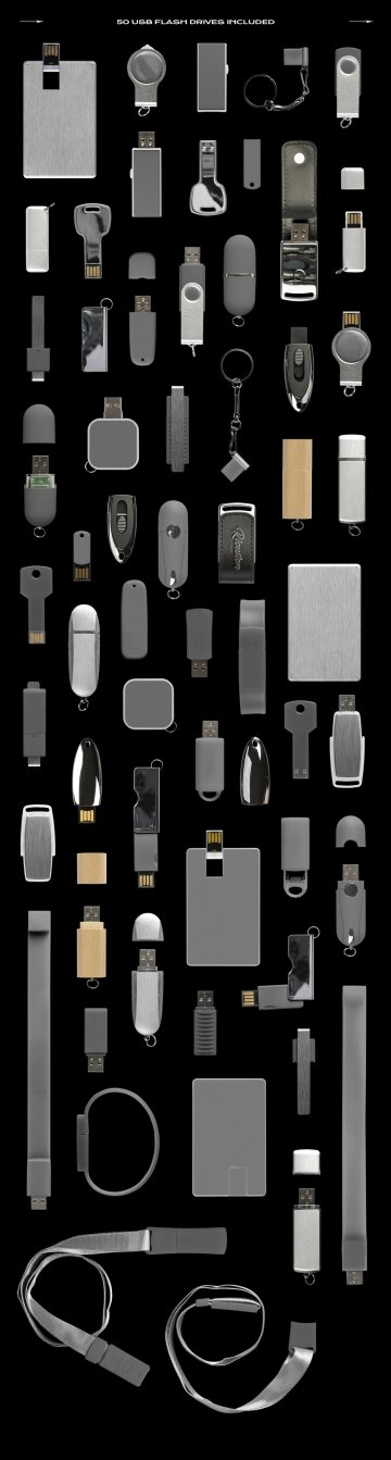 使用此捆绑包,您可以获得 50 个闪存驱动器模型和 5 个链模型,适用于高分辨率 3000x2000 像素、300dpi 的 Adobe Photoshop。完全可定制和高质量。在每个 USB 闪存中,阴影和反射是分开的,这使您可以使用任何颜色而不会损失具有照片般逼真效果的质量。