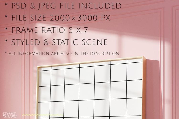 您可以在矩形框架模型中放置以下比例的艺术品: 5x7 垂直方向 这意味着您可以添加 2,5 x 3,5 英寸、5x7 英寸、10x14 英寸、20x28 厘米等尺寸的设计