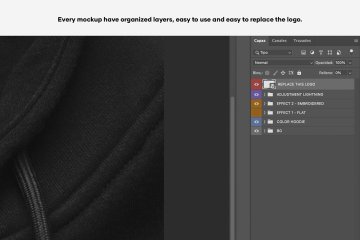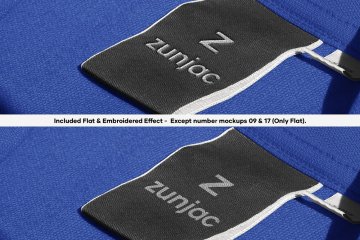 该模型包括具有 2 种效果样式的智能对象(替换此屏幕) - 平面和刺绣。可定制的夹克颜色和标签颜色。