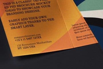 这是一个优雅的三折 psd 小册子样机,具有打开和关闭的视图来显示您的印刷设计。借助智能层轻松添加您自己的图形。