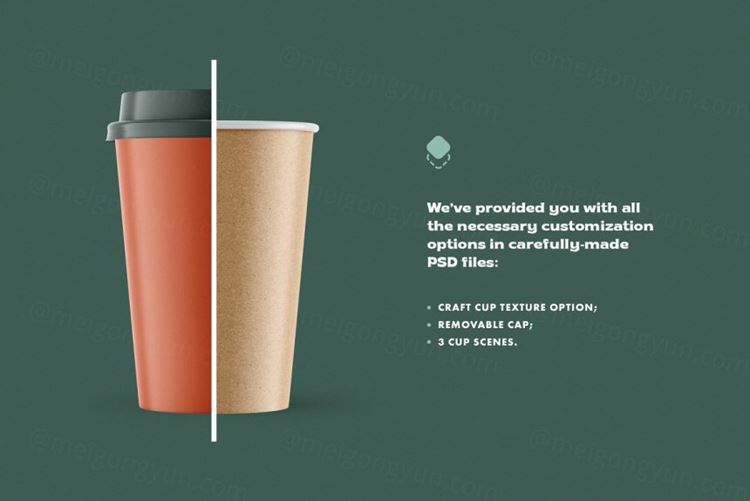 这个模型可以使用的次数没有限制:实际上,越多越好!包中提供了3 个杯子场景(有/无吸管的站立式和飞行版),只需查看哪个更好地展示您的设计。不需要启用上限?只需单击几下即可将其关闭!你喜欢工艺杯质地吗?没问题,我们也添加了它。专注于为模型选择设计,不要担心过程本身 - 包含智能对象会顺利进行。享受您在此咖啡杯模型上显示的纹理、标识、插图或广告,别忘了回收利用!