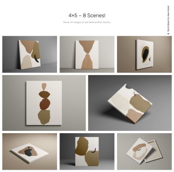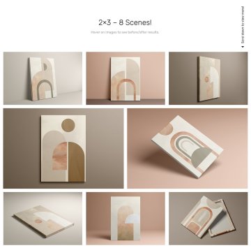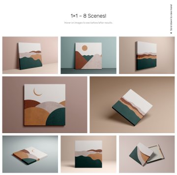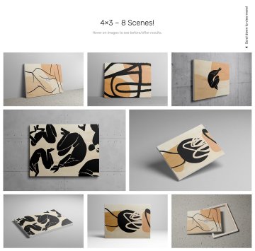 使用我们的“画布模型”-Studio Scenes,使您的艺术品展示更具吸引力!借助智能对象层,只需单击几下即可放置您的设计。包含记录良好的用户指南PDF文件。在七个最常见的画布纵横比之间进行选择:1×1、3×2、2×3、4×3、3×4、5×4、4×5。每个画布都有三种不同的边框包裹选项:“图像包裹”,“镜面包裹”,“颜色包裹”。所有模型均具有超高分辨率(300 dpi中为6000 x 4000像素)。非常适合印刷和网页设计。