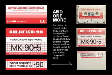 奖励3/盒式磁带标签和J-card模板包括在模型中:苏联设计风格,完全可编辑(矢量形状和免费谷歌字体)。因此,您可以轻松创建您的风格化设计