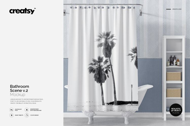 您可以使用智能对象将自己的设计放在窗帘,地板,墙壁上,还可以更改毛巾,架子,杆,支架,浴缸的颜色;