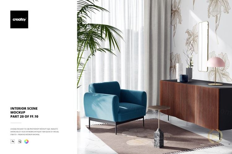 室内设计墙壁地毯扶手沙发场景展示样机PSD模板 Interi