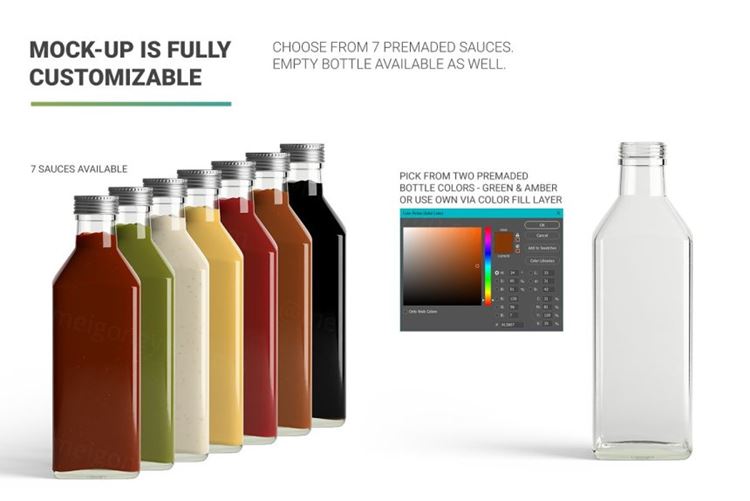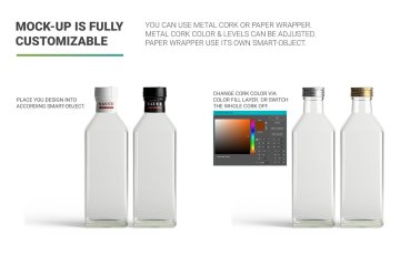 瓶颈有2种选择-金属盖和纸/塑料包装。金属盖的颜色和亮度可以更改。纸/塑料包装纸具有3种反射效果-光面,半光面和哑光。通过智能对象放置包装设计。