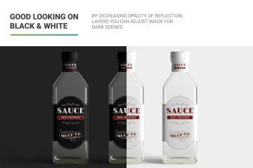 通过Smart-Object放置标签和脖子包装设计。单击两次,演示文稿已准备就绪。标签反射也可以更改。有多种选择-光泽,半光泽和哑光。通过改变反射层的不透明度来控制反射功率。