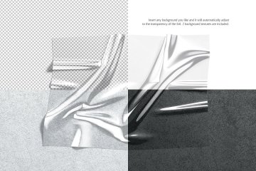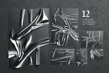 12 个皱巴巴的水平和垂直箔片,可为您的设计增添时尚效果。想出有趣的透明和不透明箔组合,在里面设计一张海报,改变背景,一键调整眩光和阴影等等。