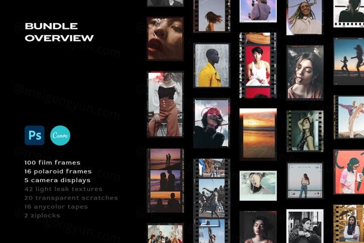 使用此捆绑包,您可以获得 120 个适用于 Adobe Photoshop 的高分辨率 5000x5000 像素、300dpi 和 116 个透明 .PNG 胶片帧,适用于 Canva。包括大量的纹理和奖励。
