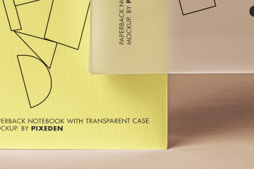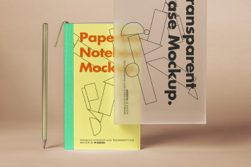 这是一个原创的、引人注目的 psd 笔记本模型场景,带有透明的外壳和铅笔。使用智能层以风格展示任何品牌设计。