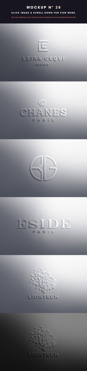 Logo Mockup 包括智能对象(REPLACE THIS SCREEN),具有 6 种不同的效果样式(浮雕、凹陷、平面、平面彩色、平面纹理银色和金色以及平面纹理原始皮革)。还包括4 种不同的观点。可自定义的背景颜色、环境光和环境模糊。