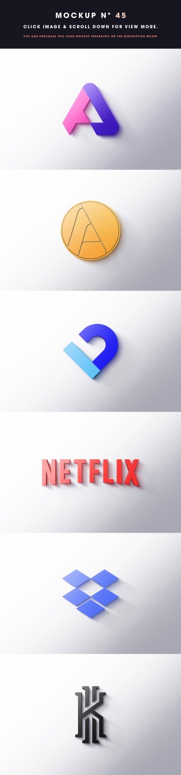 45 - 徽标样机 10 美元 - (包括 8 个不同的样机 + 更多功能 - 只有下面的链接) - https://creativemarket.com/Asylab/4430724-8-Front-3D-Logo-Mockups?u=Asylab