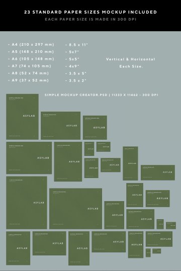 包括 Simple Mockup Creator + 关于其工作原理的基本解释(显示在预览图像上)包含不同的纸张尺寸(A4、A5、A6、A7、A8、A9 | 8.5 x 11" | 5x7" | 5x5" | 4x9" | 3.5 x 5" | 3.5 x 2") 所有纸张尺寸均采用垂直和水平位置,5x5" 除外。