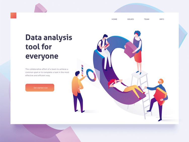 图穷联素材库 » 2.5D三维等距团队共同构建饼状图/数据分析/团队协作着陆页