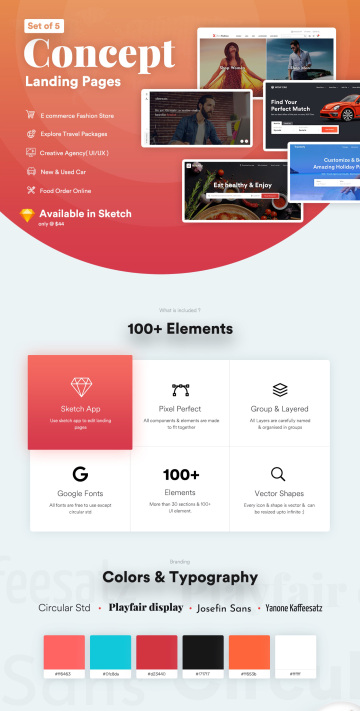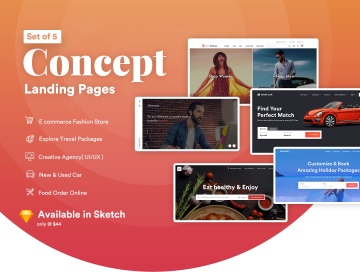 多类别登陆页面草图模板专用于创意机构,食品订购或餐厅,汽车买卖,探索旅游和时尚电子商务购物商店。