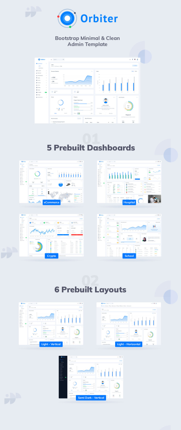 Orbiter是最小且干净的Bootstrap管理模板。它使用最新的Bootstrap版本和最新的Laravel版本构建,同时牢记灵活性。它带有在线文档,使开发人员更容易。它还具有针对CRM,电子商务,医院,加密和学校的专用超轻量级演示。它还带有垂直,水平,半暗,盒装,RTL和紧凑版式版本。