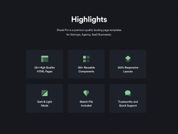 Shade Pro是集合了56个生产就绪的html模板,用于您的Saas产品,软件,启动,应用程序和许多其他相关服务。您的用户会喜欢您的网站,因为它为他们提供了独特的用户体验(UX),简洁,现代且美观的设计。Shade Pro模板将帮助您在所需客户面前成功展示您的产品或服务。