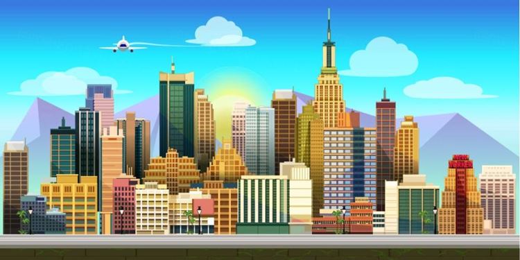 扁平卡通城市高楼风景房屋平面渐变UI海报背景设计素材